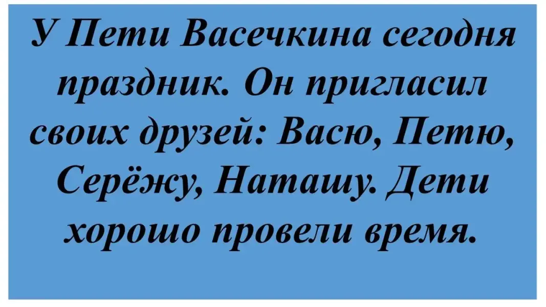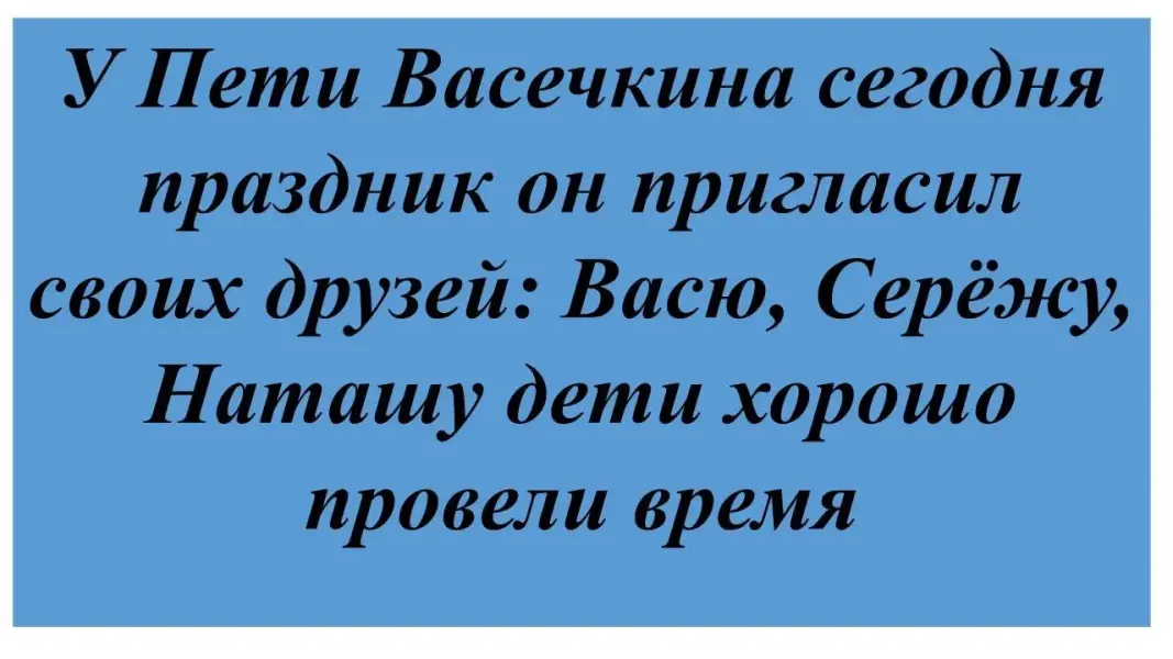 | У Пети Васечкина сегодня праздник он пригласил своих друзей: Васю, Серёжу, Наташу дети хорошо провели время |