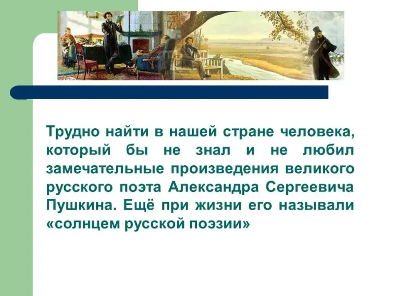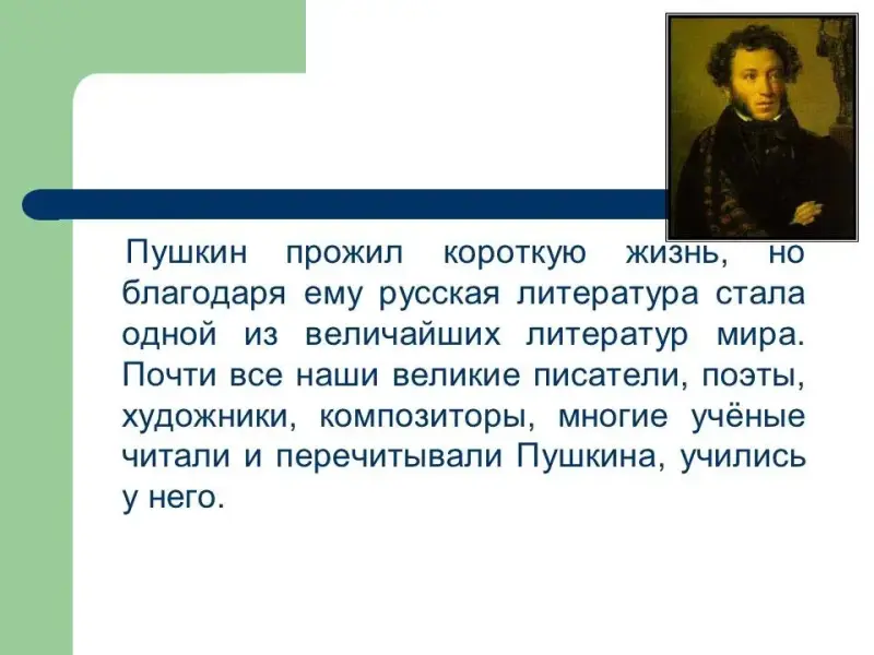 Пушкин прожил короткую жизнь, но благодаря ему русская литература стала одной из величайших литератур мира. Почти все наши великие писатели, поэты, художники, композиторы, многие учёные читали и перечитывали Пушкина, учились у него.