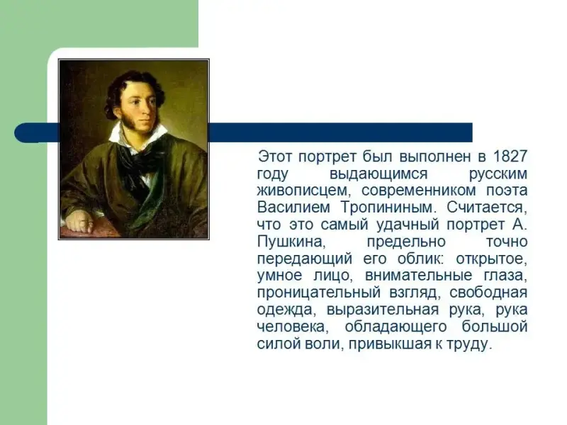 Этот портрет был выполнен в 1827 году выдающимся русским живописцем, современником поэта Василием Тропининым. Считается, что это самый удачный портрет А. Пушкина, предельно точно передающий его облик: открытое, умное лицо, внимательные глаза, проницательный взгляд, свободная одежда, выразительная рука, рука человека, обладающего большой силой воли, привыкшая к труду.