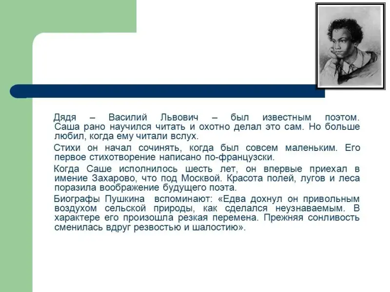 Биографы Пушкина вспоминают: "Едва дохнул он привольным воздухом сельской природы, как сделался неузнаваемым. В характере его произошла резкая перемена. Прежняя сонливость сменилась вдруг резвостью и шалостию".