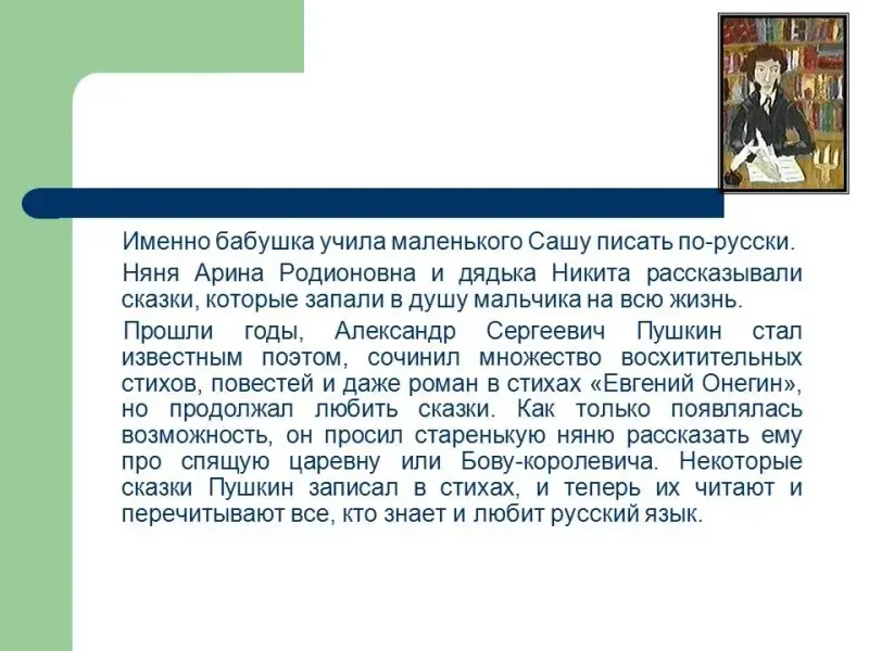 Прошли годы, Александр Сергеевич Пушкин стал известным поэтом, сочинил множество восхитительных стихов, повестей и даже роман в стихах "Евгений Онегин", но продолжал любить сказки. Как только появлялась возможность, он просил старенькую няню рассказать ему про спящую царевну или Бову-королевича. Некоторые сказки Пушкин записал в стихах, и теперь их читают и перечитывают все, кто знает и любит русский язык.