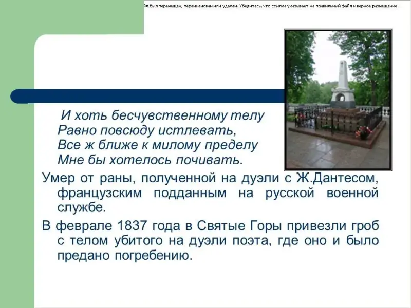 В феврале 1837 года в Святые Горы привезли гроб с телом убитого на дуэли поэта, где оно и было предано погребению.