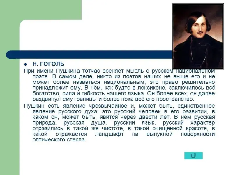 Пушкин есть явление чрезвычайное и, может быть, единственное явление русского духа: это русский человек в его развитии, в каком он, может быть, явится через двести лет. В нём русская природа, русская душа, русский язык, русский характер отразились в такой же чистоте, в такой очищенной красоте, в какой отражается ландшафт на выпуклой поверхности оптического стекла.