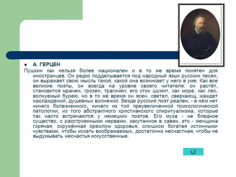 Он дал окончательную обработку нашему языку, который теперь по своему богатству, силе, логике и красоте формы признается даже иностранными филологами едва ли не первым после древнегреческого; он отозвался типическими образами, бессмертными звуками на все веяния русской жизни.