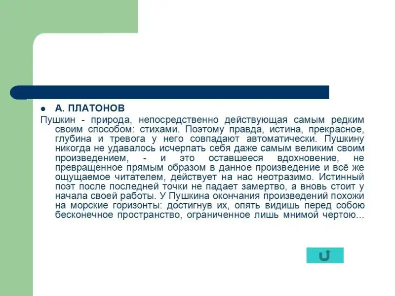 Пушкин - природа, непосредственно действующая самым редким своим способом: стихами. Поэтому правда, истина, прекрасное, глубина и тревога у него совпадают автоматически. Пушкину никогда не удавалось исчерпать себя даже самым великим своим произведением, - и это оставшееся вдохновение, не превращенное прямым образом в данное произведение и всё же ощущаемое читателем, действует на нас неотразимо. Истинный поэт после последней точки не падает замертво, а вновь стоит у начала своей работы. У Пушкина окончания произведений похожи на морские горизонты: достигнув их, опять видишь перед собою бесконечное пространство, ограниченное лишь мнимой чертою...