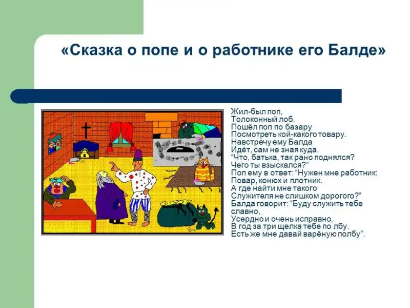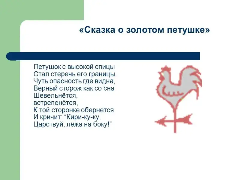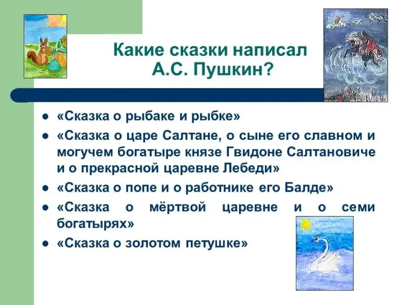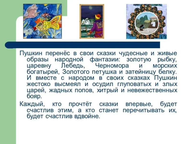 Пушкин перенёс в свои сказки чудесные и живые образы народной фантазии: золотую рыбку, царевну Лебедь, Черномора и морских богатырей, Золотого петушка и затейницу белку. И вместе с народом в своих сказках Пушкин жестоко высмеял и осудил глуповатых и злых царей, жадных попов, хитрый и невежественных бояр.