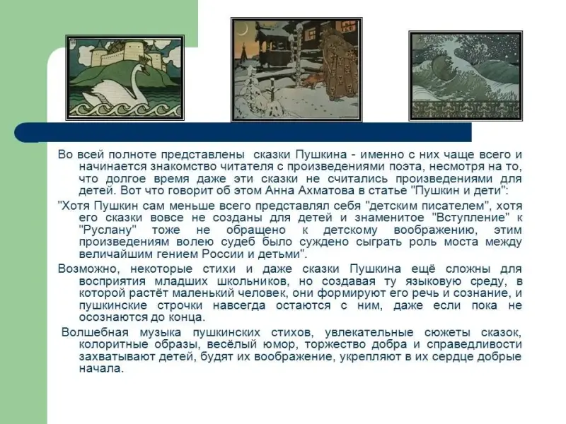 Волшебная музыка пушкинских стихов, увлекательные сюжеты сказок, колоритные образы, весёлый юмор, торжество добра и справедливости захватывают детей, будят их воображение, укрепляют в их сердце добрые начала.