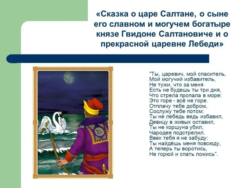 - "Сказка о царе Салтане, о сыне его славном и могучем богатыре князе Гвидоне Салтановиче и о прекрасной царевне Лебеди"