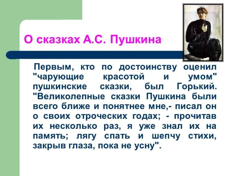 Первым, кто по достоинству оценил "чарующие красотой и умом" пушкинские сказки, был Горький. "Великолепные сказки Пушкина были всего ближе и понятнее мне,- писал он о своих отроческих годах; - прочитав их несколько раз, я уже знал их на память; лягу спать и шепчу стихи, закрыв глаза, пока не усну".