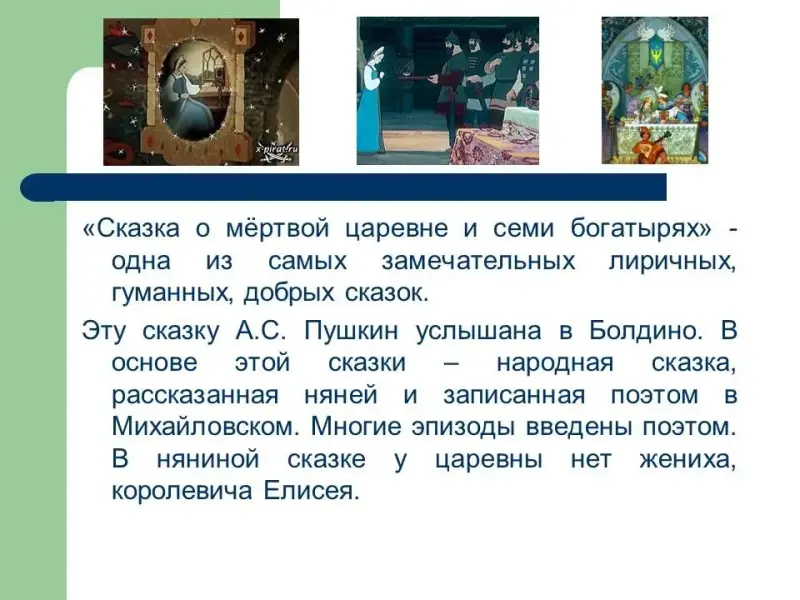 Эту сказку А.С. Пушкин услышана в Болдино. В основе этой сказки - народная сказка, рассказанная няней и записанная поэтом в Михайловском. Многие эпизоды введены поэтом. В няниной сказке у царевны нет жениха, королевича Елисея.
