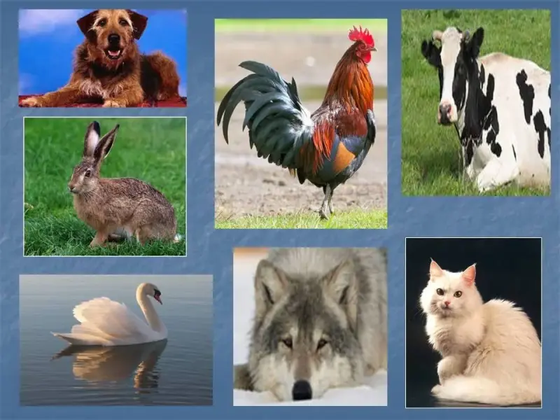 Картинки животных: собака, заяц, петух, корова, лебедь, волк, кошка