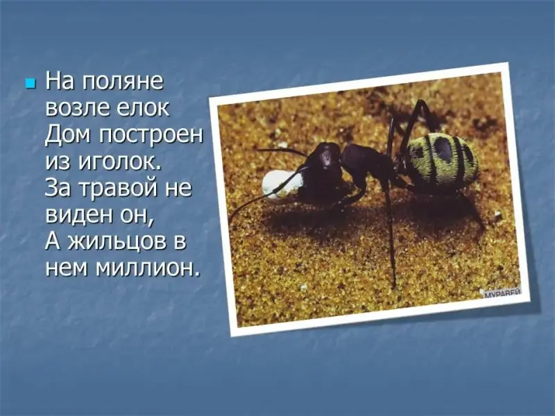 - Чем полезны муравьи? (уничтожают вредных насекомых, гусениц) (Слайд 10)