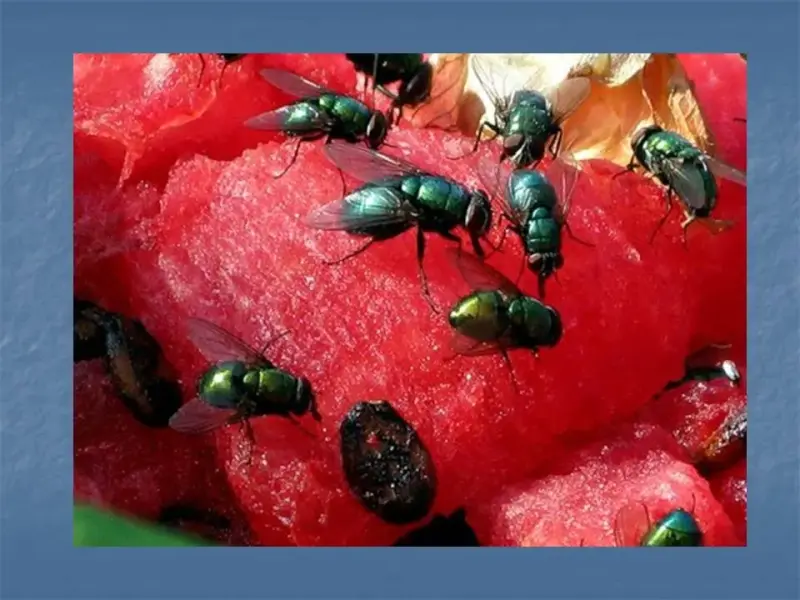 Муха - это очень вредное насекомое т.к. своими лапками она переносит до 42 болезней. Вот сядет муха на хлеб и оставит там микробы. Вот почему всегда надо закрывать пищу от мух, мыть стол, посуду, руки, если мухи побывали там. С мухами надо бороться чистотой. (Слайд 14)