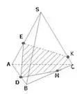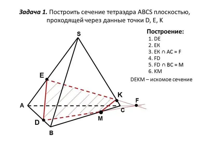 - Задача 1. Построить сечение тетраэдра АВСS плоскостью, проходящей через данные точки D, E, K.
