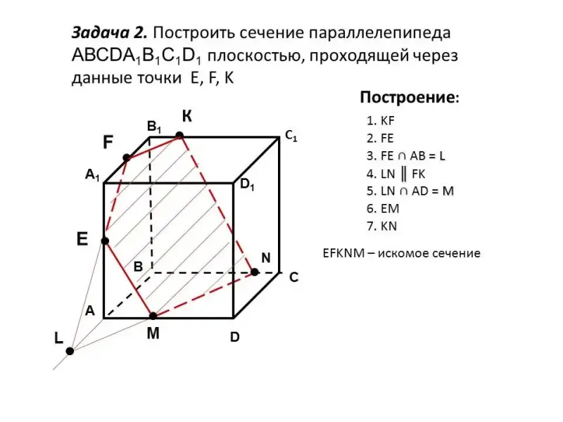 - Задача 2. Построить сечение параллелепипеда АВСDА1В1С1D 1 плоскостью, проходящей через данные точки Е, F, K.