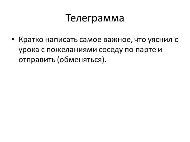 Прием "Телеграмма" (приём актуализации субъективного опыта). Очень краткая запись. Кратко написать самое важное, что уяснил с урока с пожеланиями соседу по парте и отправить (обменяться). (Слайд 14).