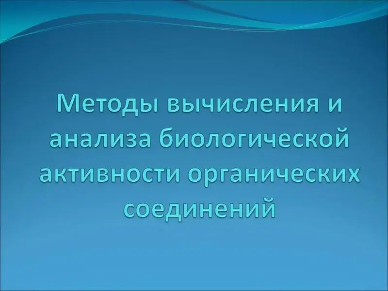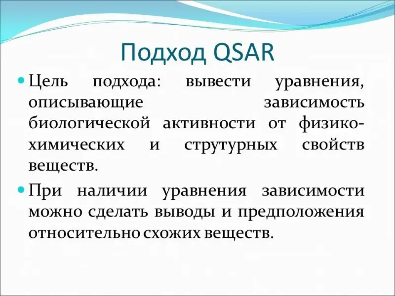 Учитель знакомит обучающихся с темой урока (слайд 1), напоминает понятие биологической активности, рассказывает про подход QSAR (Quantitative Structure - Activity Relationship (Количественные корреляции структура ? активность)). Целью данного подхода является выведение уравнений, описывающих зависимость биологической активности от физико-химических и структурных свойств веществ. При наличии данных уравнений можно сделать выводы о возможном влиянии на организм человека относительно схожих веществ (слайд 2).