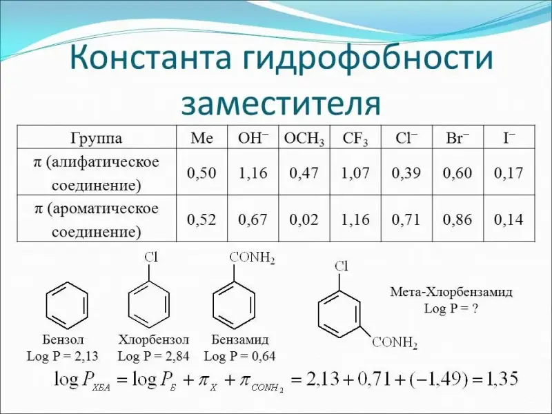 Различные заместители, вводимые в органическое соединение, могут изменять коэффициент липофильности (слайд 8). Учитель приводит примеры расчета коэффициентов липофильности соединения по значениям Log P схожих веществ и с использованием константы гидрофобности заместителя.