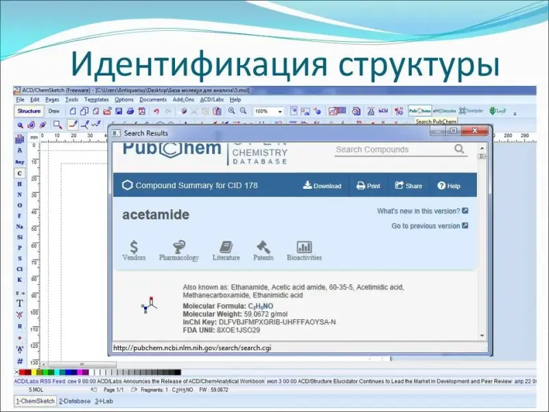 Также данная программа позволяет выполнить идентификацию органического соединения с помощью базы данных PubChem и получить сведения об использовании соединения в фармацевтической промышленности, получить различные данные о физико-химических свойствах вещества (слайд 11).