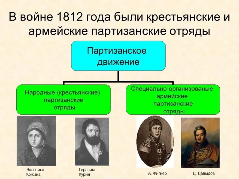Ведущий 1: Настоящей грозой для французов был отряд поэта-подполковника Дениса Давыдова. Страстное желание принести пользу в борьбе с захватчиками побудило его "просить себе отдельный отряд". Получив в распоряжение отряд, он начал смелые рейды по тылам противника. Слайды Д.В.Давыдов, А.Н.Сеславин и А.С.Фигнер