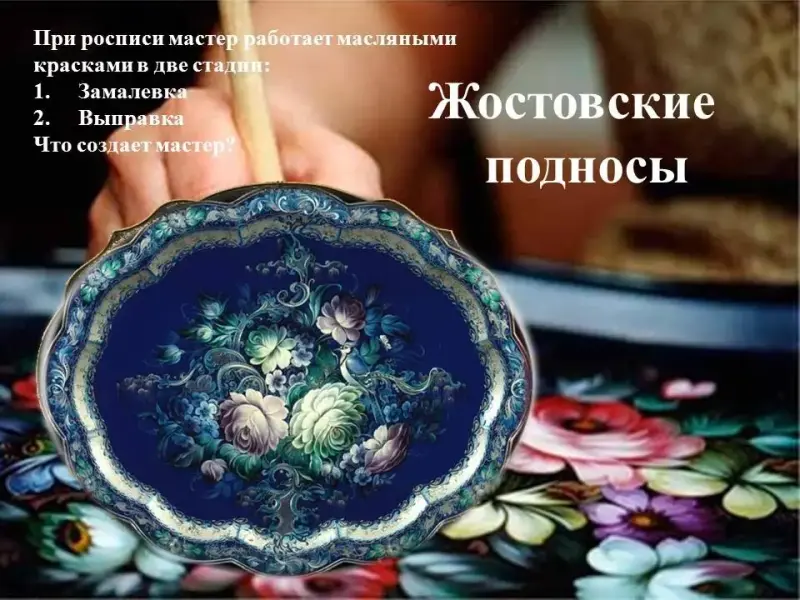 Правильно! В замечательной подмосковной деревне Жостово до сих пор изготавливают подносы и расписывают их масляными красками. Жостовский поднос знают почти во всем мире. И неудивительно. Букет украшающий его, великолепен, прост и выразителен. А цветы как будто бы светятся изнутри! <Слайд 4>.