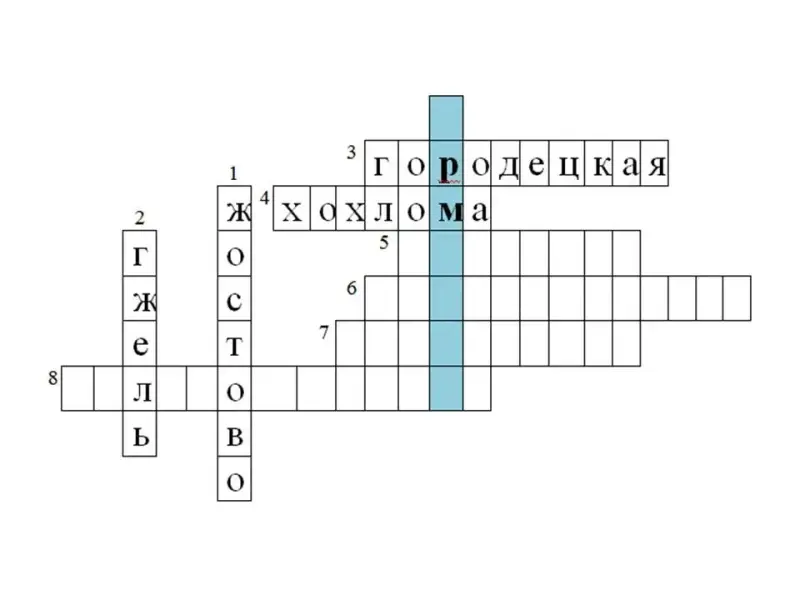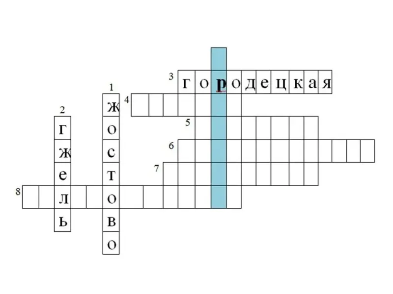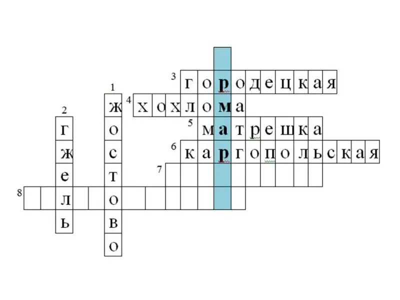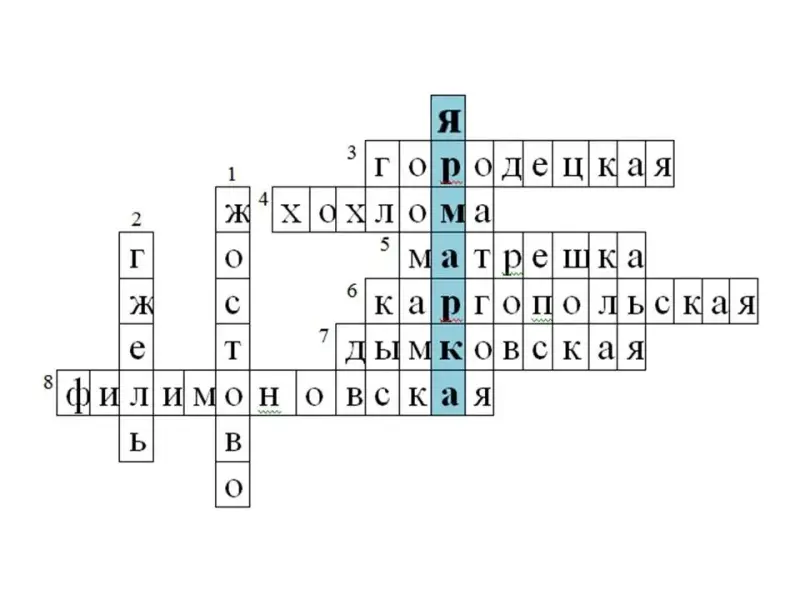 Разработка данного урока подразумевает, что учащиеся уже знают основные народные промыслы России. Презентация составлена в виде кроссворда с заключительным словом, чтобы повысить интерес учащихся.
