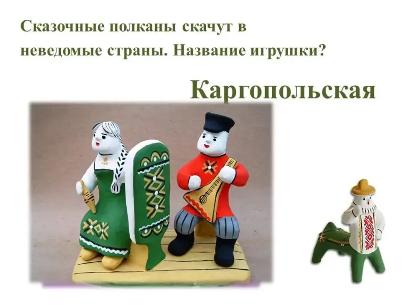 Да, действительно, полкан- сказочное чудище с головой и руками человека и туловищем лошади является отличительным персонажем каргопольской игрушки. В наше время каргопольские игрушки можно и в магазине, и на выставке, и в музее. <Слайд 14>.