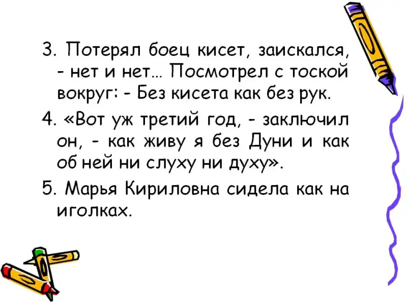 5. Марья Кириловна сидела как на иголках (обстоятельство)