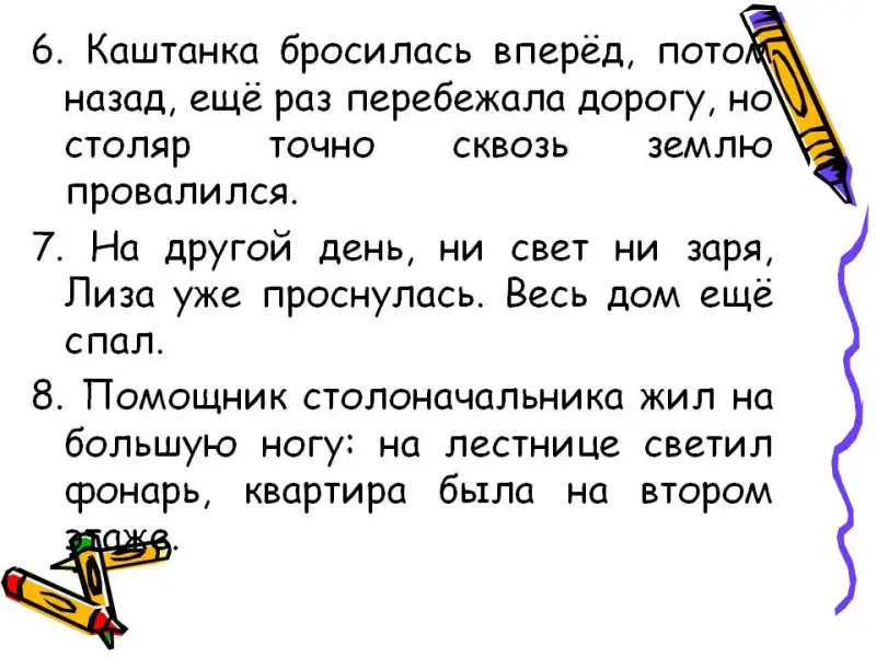 6. Каштанка бросилась вперёд, потом назад, ещё раз перебежала дорогу, но столяр точно сквозь землю провалился (сказуемое)