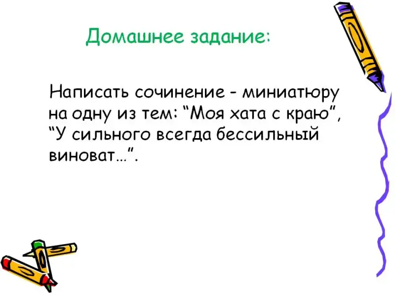 VI. Домашнее задание: написать сочинение - миниатюру на одну из тем: "Моя хата с краю", "У сильного всегда бессильный виноват…" (слайд 17)