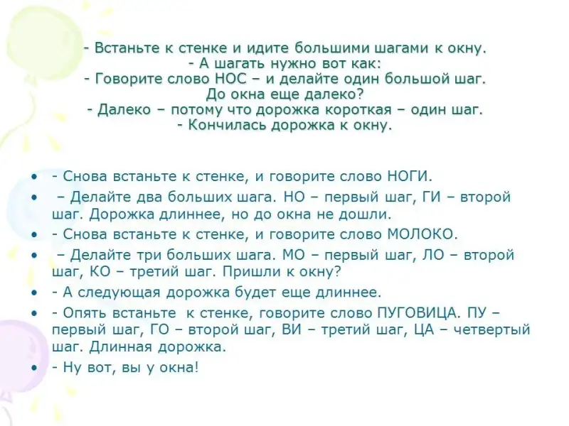 - Снова встаньте к стенке, и говорите слово НОГИ. Делайте два больших шага. НО - первый шаг, ГИ - второй шаг. Дорожка длиннее, но до окна не дошли.