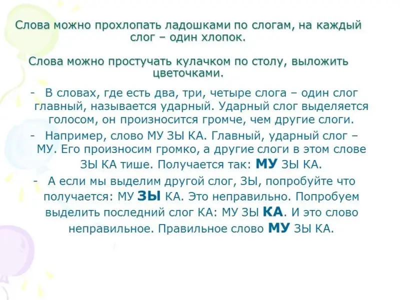 - В словах, где есть два, три, четыре слога - один слог главный, называется ударный. Ударный слог выделяется голосом, он произносится громче, чем другие слоги. Например слово МУ ЗЫ КА. Главный, ударный слог МУ. Его произносим громко, а другие слоги в этом слове ЗЫ КА тише. Получается так: МУ ЗЫ КА. А если мы выделим другой слог, ЗЫ, попробуйте что получается: МУ ЗЫ КА. Это неправильно. Попробуем выделить последний слог КА: МУ ЗЫ КА. И это слово неправильное. Правильное слово МУ ЗЫ КА.