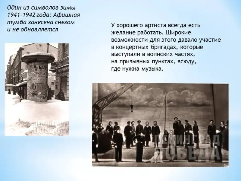 В театрах, в филармонии и консерватории шли концерты, постановки, на радио звучала музыка. Город продолжал жить и дышать. (слайд 11)