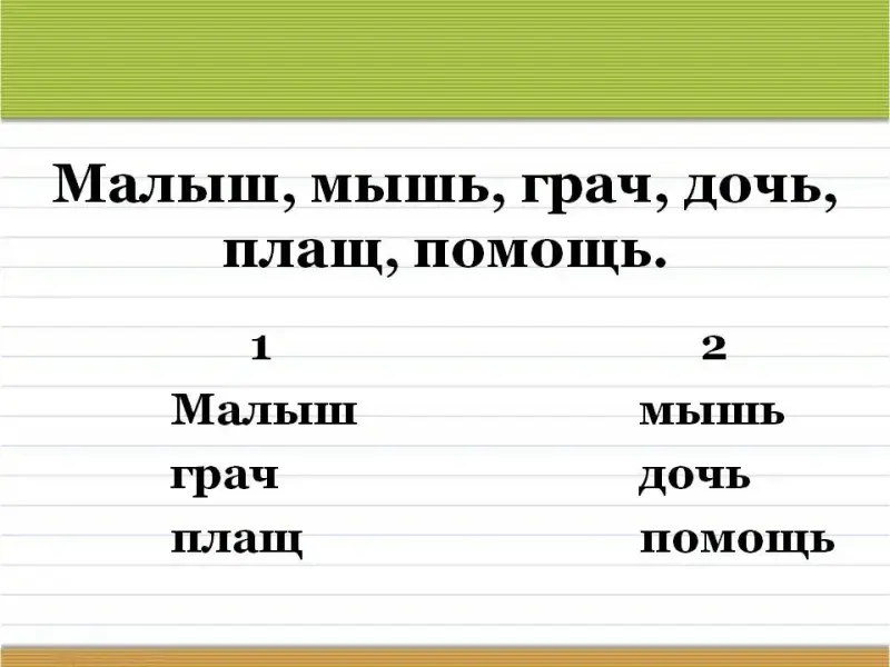 На доске: Малыш, мышь, грач, дочь, плащ, помощь.
