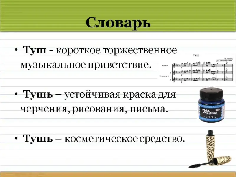 - Какое значение имеет слово тушь в упражнении? (Устойчивая краска для черчения, рисования, письма; косметическое средство.)