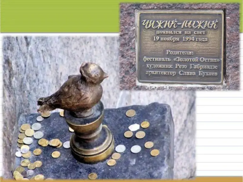 3. Существует ещё и народное поверие, что эта статуя исполняет желания. Чтобы желание исполнилось - нужно попасть монеткой в чижа так, чтобы после отскока она осталась на постаменте.