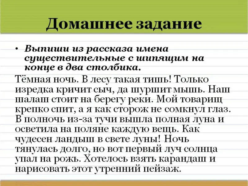 Выпиши из рассказа имена существительные с шипящим на конце в два столбика.