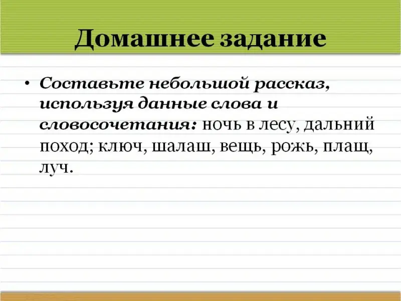 Составьте небольшой рассказ, используя данные слова и словосочетания: ночь в лесу, дальний поход; ключ, шалаш, вещь, рожь, плащ, луч.