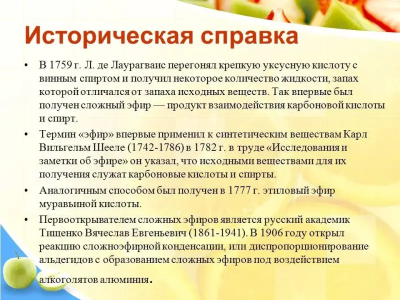 Историческая справка (сообщение ученика) (Слайд № 8): Много веков назад арабы уже знали различные способы получения душистых веществ из растений и выделений животных. Душистые вещества содержатся обычно в виде капелек в особых клетках. Они встречаются в цветах, листьях, кожуре плодов и даже в древесине. Их называют эфирными маслами. Они представляют собой сложные смеси душистых органических веществ. В 1759 г. Л. де Лаурагваис перегонял крепкую уксусную кислоту с винным спиртом и получил некоторое количество жидкости, запах которой отличался от запаха исходных веществ. Так впервые был получен сложный эфир - продукт взаимодействия карбоновой кислоты и спирт. Термин "эфир" впервые применил к синтетическим веществам Карл Вильгельм Шееле (1742-1786) в 1782 г. в труде "Исследования и заметки об эфире" он указал, что исходными веществами для их получения служат карбоновые кислоты и спирты, а в качестве катализатора используется минеральная серная кислота. Аналогичным способом был получен в 1777 г. этиловый эфир муравьиной кислоты. Также первооткрывателем сложных эфиров является русский академик Тищенко Вячеслав Евгеньевич (1861-1941). В 1899 году он разработал способ получения алкоголята алюминия. В 1906 году открыл реакцию сложноэфирной конденсации, или диспропорционирование альдегидов с образованием сложных эфиров под воздействием алкоголятов алюминия.