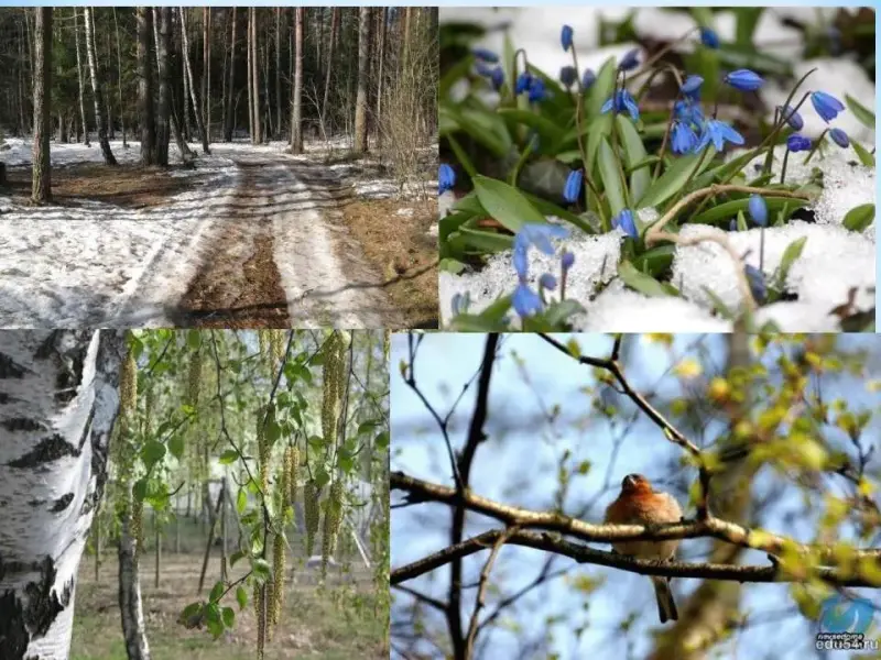 Тает зимний (снег). Над головой видны осыпанные надувшимися смолистыми почками тонкие (ветки) берез. На лесных полянах первые (появились проталины). Кое-где на пригреве начинают (зацветать),
