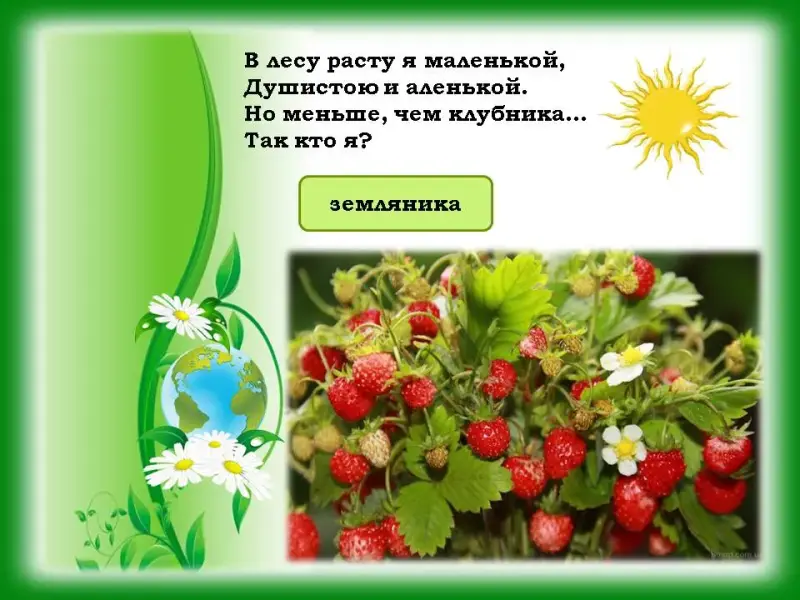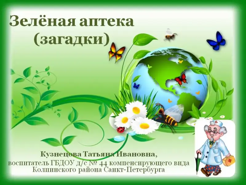 Ведущий: Природа полна необыкновенных чудес. Если с ней дружить, она раскроет нам свои секреты и тайны. Сегодня мы вместе с нашими детьми попробуем разгадать некоторые из них. Природа предоставляет человеку огромное разнообразие даров - лекарства от всех на свете болезней. Их надо только знать и уметь ими пользоваться. Давным-давно люди заметили, что все звери лечатся травами. Больные животные уходят в лес, чтобы найти какую-то травку, съев которую, они выздоравливают. Так и человек стал искать помощи от болезней у растений. Разные растения помогают от разных болезней. Сотни лет люди накапливали знания о лекарственных растениях и передавали их своим потомкам из поколения к поколению, составляя целые тома книг. Давайте и мы с вами вспомним некоторые полезные для здоровья растения, которые окружают нас в деревне и в городе, в лесу и в парке, на лугу и в поле, и даже дома на подоконнике (проводится игра для детей и родителей «Отгадай загадку» с использованием слайдовой презентации).