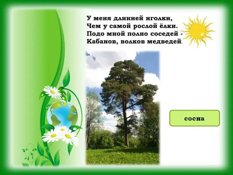 Ребёнок 1 (Берёза-Веселушка): Лучше меня дерева нету! Я такая нежная, веточки мои гибкие, ствол у меня белоснежный. Обо мне люди даже стихи и песни сочиняют. А ещё я очень полезная для людей и для зверей. Мои веники в бане просто незаменимы! А почки мои от простуды лечат. Дрова мои дают много тепла. А какой вкусный мой берёзовый сок весной! Он укрепляет организм и людям, и животным. А ещё из меня делают мебель и лыжи. Так что я - самая нужная. Я - королева леса!
