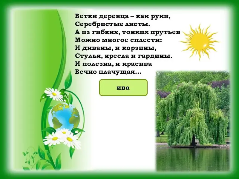 Ребёнок 3 (Ива-Хохотушка): Это я красивей всех вас! Посмотрите на мои листочки - сверху они гладкие, а снизу нежные, пушистые. А весной что может быть прекрасней моих серёжек? И людям я тоже очень нужна. Из моей коры готовят лекарства от разных болезней. Их пьют, когда болят ноги или желудок, когда высокая температура. Из моих гибких веточек плетут корзины и делают плетёную мебель. Вот какая я! Лучше всех!