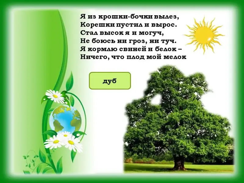 Ребёнок 2 (Дуб-Крепыш): А меня люди называют долгожителем, потому что я могу жить 300 лет. Посмотрите, какой у меня мощный ствол, крепкие руки-ветви. Из моей древесины получается самая надёжная мебель, а под тенью моих листьев в летнюю жару может укрыться и зверь, и человек. Моими плодами питаются звери, а на моих ветвях живут птицы. Мои веники в бане силы прибавляют, а моей толчёной корой можно вылечить ожоги. Я такой сильный, что даже мои листья осенью держатся на ветвях дольше всех. Я - король леса!