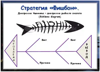 С его помощью можно в явлении различать составные части, в событиях выделять причины и последствия, аргументировать ответ и подтверждать его примерами. Основой для выполнения работы по схеме является проблема, содержащаяся в тексте или рассказе учителя. Её записывают в "голове" "фишбона", а вывод, получаемый по ходу работы, записывается в "хвосте". Использование стратегии «Фишбон» возможно при большом количестве информации. При этом возможно дробление информации на смысловые части, которые дополняют друг друга. Содержащаяся в этих частях информация не сравнивается, а суммируется для более полного анализа и оценки.