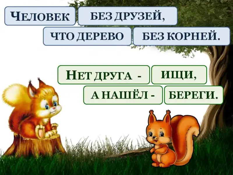 Ведущий: К двум столам приглашается от каждого класса команда из 3 человек. Белочка никак не может из этих слов собрать пословицы, помогите ей. Получившиеся пословицы приклейте на лист.