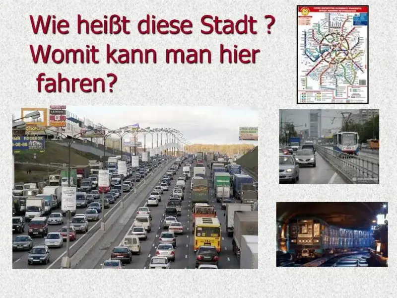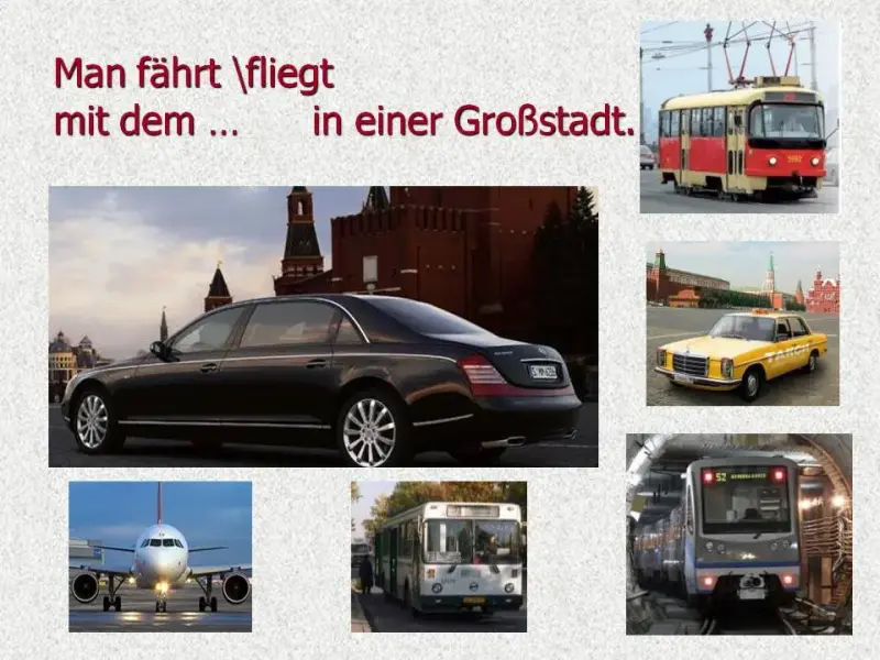 - Stellt euch vor, wie besuchen heute eine Großstadt. Hier gibt es verschiedene Verkehrsmittel. Seht die Folie aufmerksam an und antwortet "Welche Verkehrsmittel könnt ihr nennen?" <Слайд 2>