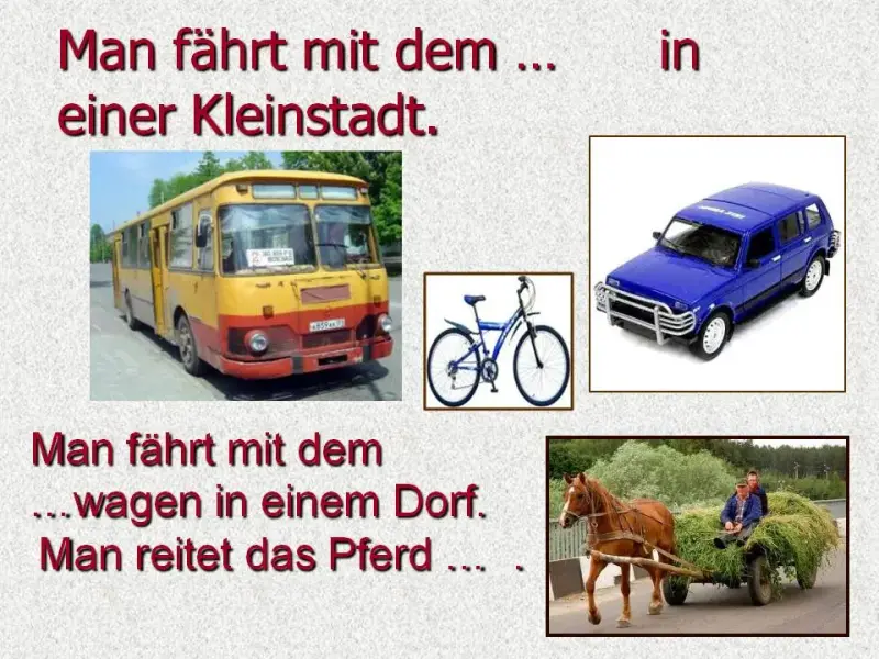 Учащиеся: Man fährt mit dem Auto in einer Kleinstadt. …mit dem Bus. Man fährt Fahrrad.