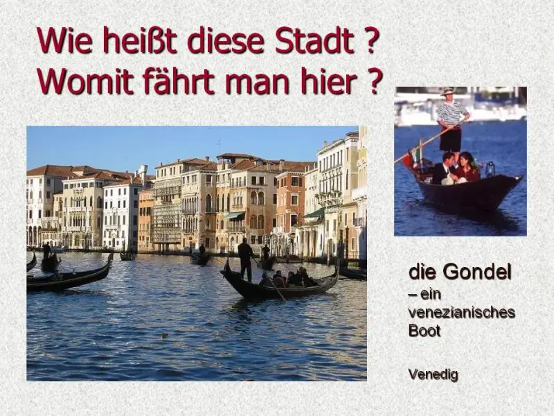 Учащийся: Das ist Venedig. Hier fährt man mit der Gondel. (если дети не знают этого, учитель объясняет, der stehende Gondolier bewegt das Boot vorwärts, mit dem Ruder). <Слайд 6>