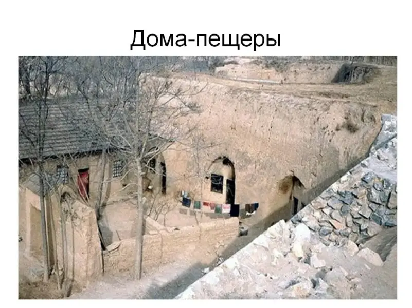Д. Дома местных крестьян здесь необычны. Они живут в пещерах, вырытых в склонах холмов, так как в этой местности нет ни древесины, ни камня и порою заводят огород прямо над своим